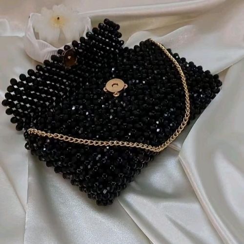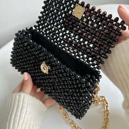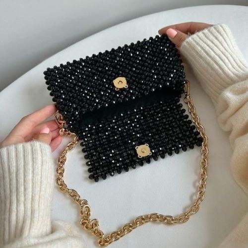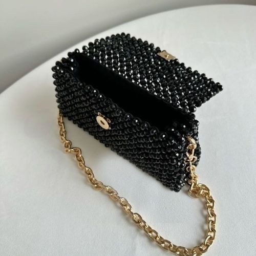 L’accessoire parfait pour vos soirées. Ce sac à main en perles noires tissées, avec sa chaîne dorée, ajoute une touche d’élégance et de sophistication à n’importe quelle tenue de soirée.