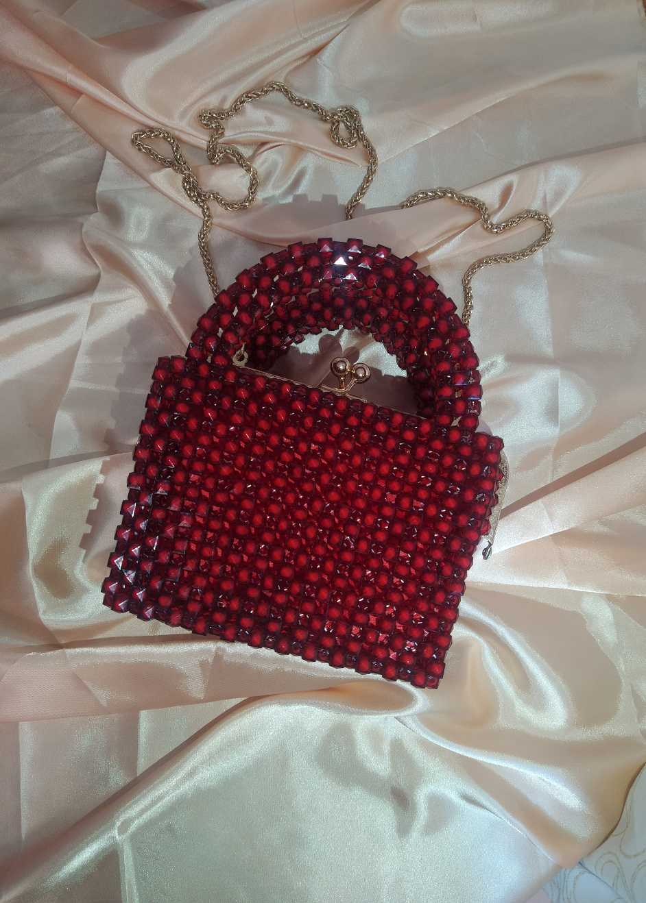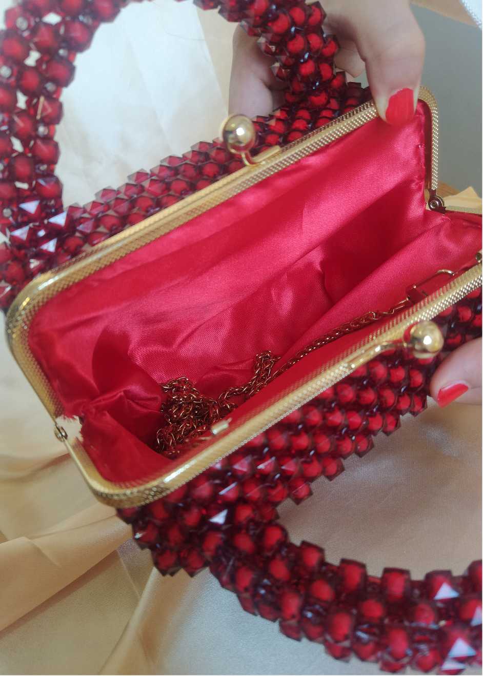 L’accessoire parfait pour un look glamour. Ce sac de soirée rouge en perles, avec sa poignée et sa chaîne dorée, ajoute une touche de passion et de sophistication à votre tenue.
